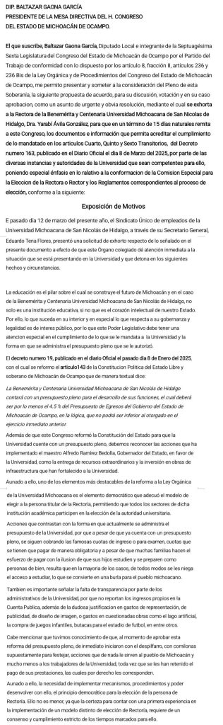 «Este congreso del estado en un ejercicio de responsabilidad dotó a la universidad Michoacán de un marco jurídico moderno diseñado para fortalecer su autonomía pero también para democratizar sus procesos», enfatiza ese exhorto sometido ante el Pleno camaral en la sesión de este viernes y que fue aprobado por mayoría de 35 votos, mismo que vía documento ya se envió a la oficina de Ávila González, quien se ha molestado porque fue a solicitud de Eduardo Tena Flores, dirigente del Sindicato Único de Empleados de la Universidad Michoacana hecha formalmente al propio diputado petista en la sede del Legislativo el pasado 12 de marzo.