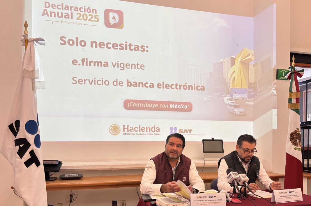 En rueda de prensa, el Servicio de Administración Tributaria (SAT), encabezado por Ignacio Zahid Zamudio Méndez, exhortó a las empresas a cumplir en tiempo y forma con la presentación de su Declaración Anual 2025, cuyo periodo inició el pasado 1 de enero y concluirá el 31 de marzo de 2026.