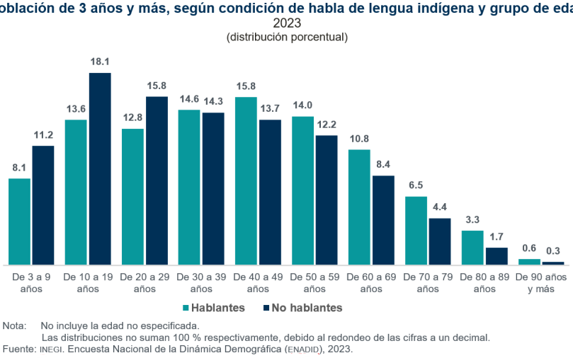 En México, en 2023, 6 de cada 100 personas de 3 años y más hablaban alguna lengua indígena. De ellas, 34.6 % tenía entre 3 y 29 años, en tanto que, para este mismo rango de edad, quienes no hablaban una lengua indígena representaron 45.1 por ciento. En el grupo de 60 años y más, la población hablante de lengua indígena representó 21.2 % del total de hablantes, mientras que la no hablante agrupó 14.8 %.