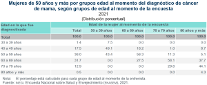 De acuerdo con la ENASEM 2021, había 14 millones 610 mil 380 mujeres de 50 años y más -se excluye a quienes no especificaron su edad-. De ellas, a 412 mil 369 (2.8 %) se les diagnosticó algún tipo de cáncer; 176 mil 672 (42.8 %) de estas últimas, reportaron tener cáncer de mama. Durante los últimos dos años, 109 mil 494 (62.0 %) recibieron algún tipo de tratamiento médico, mientras que 67 mil 178 (38.0 %) no lo tuvieron.
