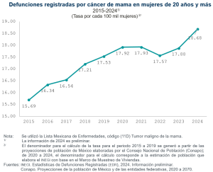 Durante la última década, la tasa de defunciones por cáncer de mama se incrementó de 15.7 en 2015 a 18.7 en 2024, por cada 100 mil mujeres de 20 años y más.