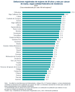 Chihuahua registró la tasa más elevada de cáncer de mama en mujeres, con 27.6, seguida por Baja California Sur, con 24.0, mientras que las tasas más bajas se ubicaron en Guerrero, con 12.7 y Tlaxcala, con 12.9 fallecimientos por cada 100 mil mujeres de 20 años y más.
