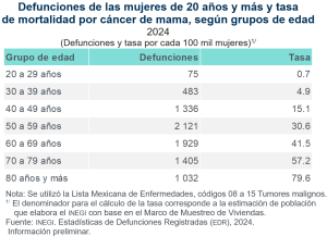 En 2024, el mayor número de defunciones por cáncer de mama se registró en las mujeres de 50 a 59 años, con 2 mil 121 defunciones, que representaron una tasa de 30.6 fallecimientos por cada 100 mil mujeres. Entre las mujeres de 80 años y más, se produjo la tasa más alta, con 79.6 defunciones.
