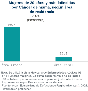 De las mujeres de 20 años y más que fallecieron por cáncer de mama y tenían afiliación en alguna institución de salud, 74.9 % estaba en el IMSS, 16.0 % en el ISSSTE y 0.2 %, en el Seguro Popular/Instituto de Salud para el Bienestar (INSABI). De las mujeres de 20 años y más que fallecieron por cáncer de mama, 88.4 % residía en áreas urbanas y 11.4 %, en áreas rurales.