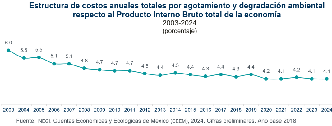 En 2024, los costos totales por agotamiento y degradación ambiental (CTADA) ascendieron a poco más de 1.38 billones de pesos corrientes, monto equivalente a 4.1 % del PIB total de la economía. En 2003, los CTADA representaron 6.0 % del PIB (ver gráfica 1). Por componentes de los CTADA, los costos por agotamiento representaron 0.4 %, mientras que los costos por degradación, 3.7 por ciento.