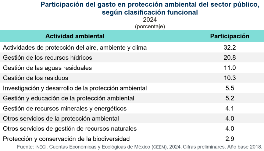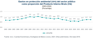 Por su parte, en 2024, los gastos en protección ambiental del sector público ascendieron a 232 mil 882 millones de pesos, equivalentes a 0.7 % del PIB total de la economía. Este porcentaje resultó similar al de 2023.