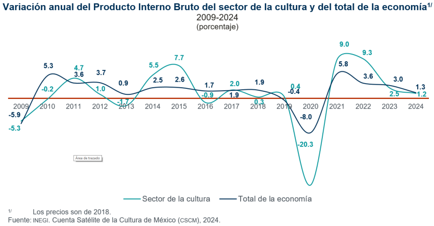 A valores constantes, el PIB del sector cultural creció 1.2 %, mientras que el total de la economía aumentó 1.3 por ciento. De 2008 a 2024, el incremento promedio anual del sector fue de 0.9 %.