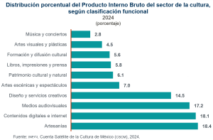 De acuerdo con la clasificación funcional -se considera el Marco de Estadísticas Culturales 2009 de la Organización de las Naciones Unidas para la Educación, la Ciencia y la Cultura-, del sector de la cultura, las áreas con mayor contribución al PIB fueron artesanías, con 18.4 %; contenidos digitales e internet —como el acceso y la transmisión de contenidos digitales—, con 18.1 %; medios audiovisuales —como televisión o cine—, con 17.2 %; y diseño y servicios creativos, con 14.5 %.