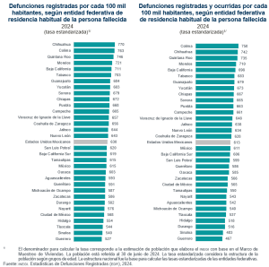 En 2024, en México, se contabilizaron 819 672 defunciones registradas. Estas se obtuvieron a partir de los certificados de defunción que suministraron las Oficialías del Registro Civil y los Servicios Médicos Forenses. La información se complementó con las actas de defunción del Registro Civil y con cuadernos estadísticos que proporcionaron las Agencias del Ministerio Público.
