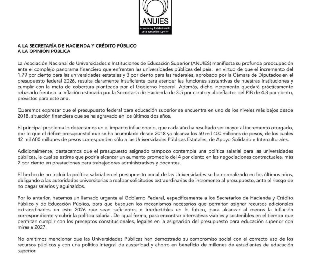 Agrupadas en la Asociación Nacional de Universidades e Instituciones de Educación Superior (ANUIES) han emitido un posicionamiento mediante el cual manifiestan su profunda preocupación por este monto asignado para el sector este año, pues el incremento aprobado no cubre siquiera el impacto de la inflación, dejando un déficit histórico de 50 mil 400 millones de pesos que afecta a millones de jóvenes estudiantes: «ANUIES manifiesta su profunda preocupación ante el complejo panorama financiero que enfrentan las universidades públicas del país, en virtud de que el incremento del 1.79 por ciento para las universidades estatales y 3 por ciento para las federales aprobado para 2026 resulta claramente insuficiente para atender las funciones sustantivas», advierten los rectores.