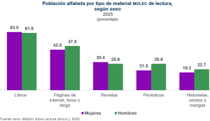 Según tipo de materiales, del total de población alfabeta de 12 años y más, 62.5 % leyó libros en los últimos 12 meses; 45.7 % declaró leer páginas de internet, foros o blogs; 29.6 % leyó revistas en los últimos tres meses; 24.8 % leyó periódicos en la última semana y 20.9 % señaló leer historietas, cómics o mangas.