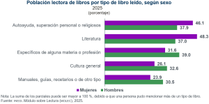 Los tipos de libros más leídos por las mujeres fueron literatura (48.3%) y autoayuda (46.1 %); para los hombres, los específicos de alguna materia (39.0 %) y de autoayuda (37.9 %).