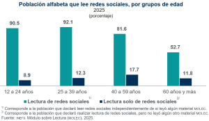 De las 103.9 millones de personas alfabetas de 12 años y más, ocho de cada 10 personas declararon leer redes sociales (Facebook, WhatsApp, X, entre otras). El mayor porcentaje de personas alfabetas lectoras de redes sociales lo obtuvo el grupo de 25 a 39 años, con 92.1 % y el menor, el de 60 años y más, con 52.7 %.