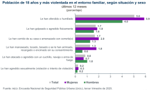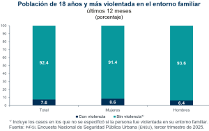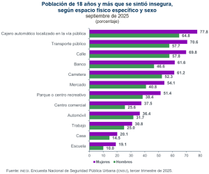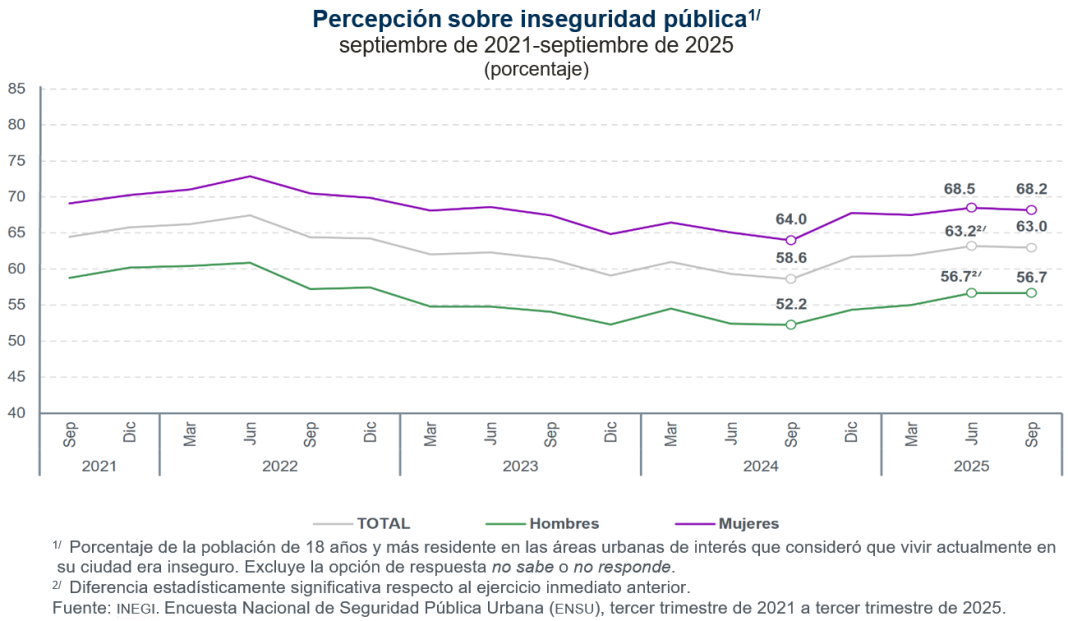 En septiembre de 2025, 68.2 % de las mujeres y 56.7 % de los hombres consideraron que vivir en su ciudad era inseguro.