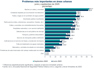 En cuanto a los principales problemas que impactaban su ciudad, en septiembre de 2025, 84.9 % de la población de 18 años y más consideró que eran los baches en calles y avenidas; 60.0 %, las coladeras tapadas por acumulación de desechos y 59.6 %, las fallas y fugas en el suministro de agua potable.