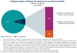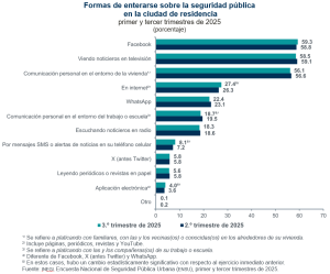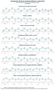 Conforme a los resultados de la ENSU del tercer trimestre de 2025, de las conductas delictivas o antisociales en los alrededores de su vivienda que la población mencionó haber visto o escuchado, el primer lugar lo tuvo el consumo de alcohol en las calles, con 58.2 %; el segundo lugar fueron los robos o asaltos, con 47.6 %; en tercero figuró la venta o consumo de drogas, que alcanzó 39.9 %; el cuarto lugar lo ocupó vandalismo en las viviendas o negocios, con 38.1 %; y el quinto lugar, disparos frecuentes con armas, con 34.8 por ciento.