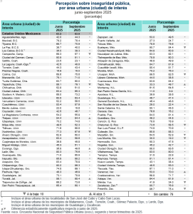 En contraste, las áreas urbanas con menores porcentajes de percepción de inseguridad fueron San Pedro Garza García, con 8.9; Piedras Negras, con 15.0; Benito Juárez, con 15.6; Los Mochis, con 19.2 y San Nicolás de los Garza, con 22.4 por ciento.