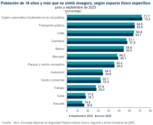 En cuanto a la percepción de inseguridad en espacios físicos específicos, 71.7 % de la población manifestó sentirse insegura en los cajeros automáticos localizados en la vía pública; 64.9 %, en el transporte público; 64.4 %, en la calle y 57.1 %, en la carretera.