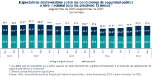En septiembre de 2025, de la población de 18 años y más, residente en las áreas urbanas de interés, 34.0 % consideró que, en los próximos 12 meses, la situación de la delincuencia e inseguridad en su ciudad seguirá igual de mal; mientras que 23.9 % de la población refirió que la situación empeorará.