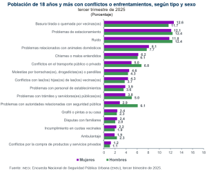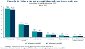 Durante el tercer trimestre de 2025, 34.3 % de la población de 18 años y más tuvo algún conflicto o enfrentamiento, de manera directa, con familiares, con personas vecinas, con personas compañeras de trabajo o escuela, con personal de establecimientos o con autoridades de gobierno.