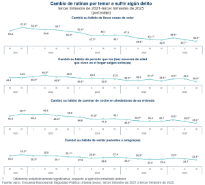 En el tercer trimestre de 2025, 40.6 % de la población de 18 años y más, residente en las áreas urbanas de interés, manifestó que modificó sus hábitos respecto a llevar objetos de valor, como joyas, dinero o tarjetas de crédito, por temor a sufrir algún delito.