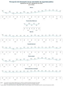 Con menores porcentajes en la percepción de un desempeño muy o algo efectivo figuraron la Guardia Nacional, con 73.2 %; la policía estatal, con 52.7 % y la policía preventiva municipal, con 46.8 por ciento.