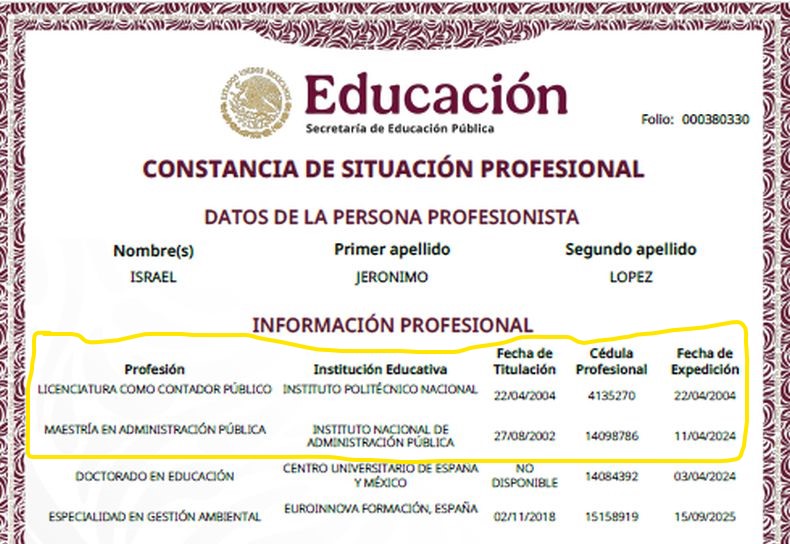 Aún más grave: en documentos oficiales del Gobierno del Estado de México fechados el 22 de septiembre de 2022, el funcionario firmó como “Dr. Israel Jerónimo López”, cuando se desempeñaba como subsecretario de Educación Media Superior. Sin embargo, el portal oficial de la SEP indica que su Doctorado en Educación (cédula 14084392) fue expedido hasta abril de 2024, dos años después de haberse ostentado con ese grado.