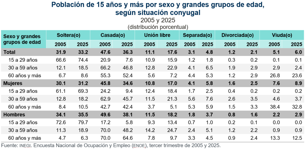De acuerdo con datos del tercer trimestre de la ENOE, entre 2005 y 2025 se observaron cambios en la situación conyugal de la población de 15 años y más.