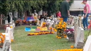 Desde la mañana estuvieron arribando las personas para comenzar a decorar y adornar sus tumbas con papel picado de colores y con flor de cempasúchil, y también con adornos que venden afuera de este panteón privado. La afluencia fue creciendo en el transcurso del día hasta esta media tarde en que en largas filas de automóviles los visitantes pretenden llegar hasta el fondo del camposanto a bordo de sus vehículos, otros lo hacen a pie cargando sus flores, su comida y sillas, algunos más llevan hasta guitarras porque la música no falta en esta reunión para dedicar la canciónfavorita a quien ha partido.