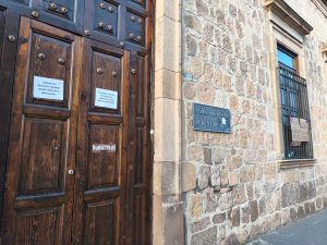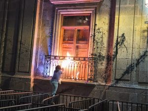 También intentaron incendiar las ventanas del edificio, pero el fuego no se propagó, por lo que terminaron quemando sus propias pancartas y lonas.