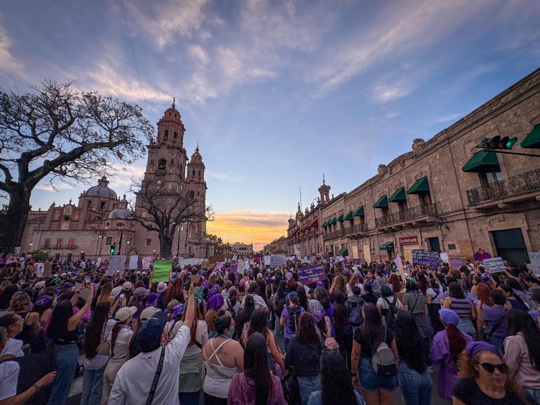 En el marco del Día Internacional de la Mujer, miles de manifestantes tomaron las calles del centro histórico de Morelia en una jornada marcada por consignas contra la violencia de género, pero también por actos de vandalismo, confrontaciones con cuerpos de seguridad y agresiones contra integrantes de la prensa.