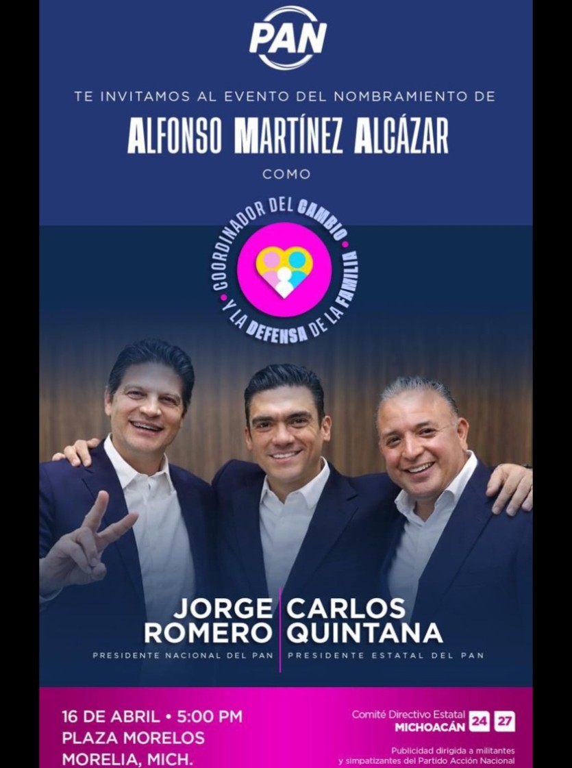 A través de invitaciones digitales e incluso mediante llamadas telefónicas, se ha estado invitando a «militantes y simpatizantes del Partido Acción Nacional (PAN)», a que acudan al evento de nombramiento de Alfonso Martínez Alcázar, como «Coordinador del cambio y la defensa de la Familia».