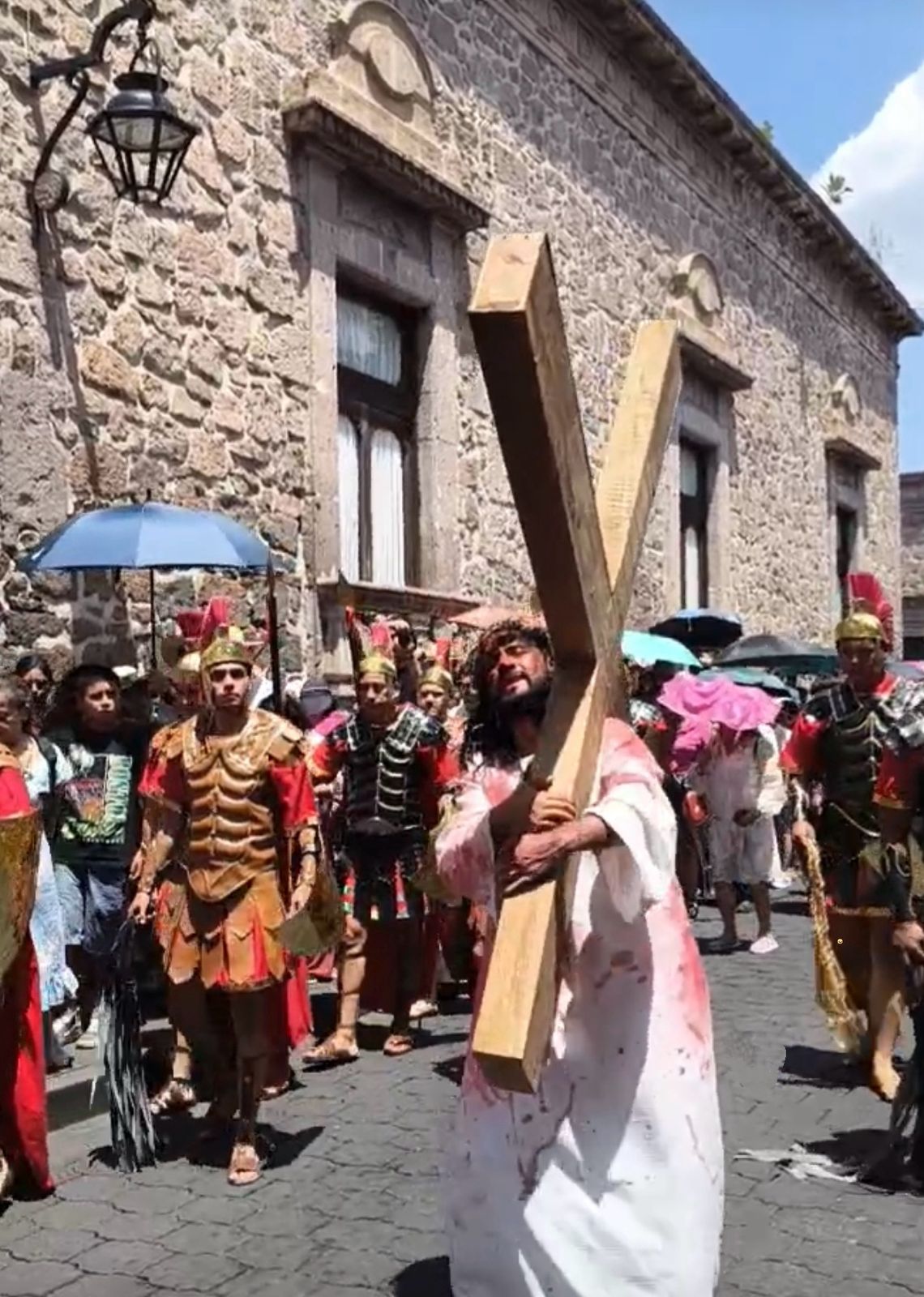 En punto de las 12:00 horas de este Viernes Santo, cientos de espectadores se reunieron en la plaza Melchor Ocampo, ubicada a un costado de la Catedral, para presenciar la tradicional escenificación del Viacrucis, una de las representaciones más significativas de la Semana Santa en la capital michoacana.