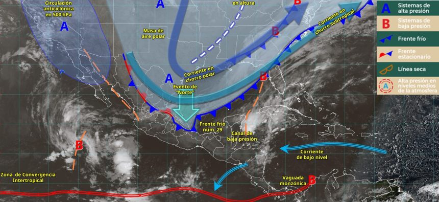 Para hoy, el frente frío núm. 29 se desplazará sobre el oriente del golfo de México, península de Yucatán y sureste del país, originando lluvias puntuales intensas en Veracruz, Tabasco, Oaxaca y Chiapas; puntuales muy fuertes en Puebla; puntuales fuertes en Hidalgo, Campeche y Quintana Roo; así como chubascos en Yucatán.