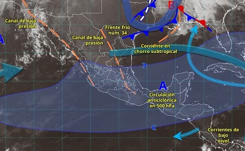 Para hoy el frente frío núm. 34 y una vaguada polar se desplazarán sobre el norte del golfo de México, dejando de afectar al país. Sin embargo, la masa de aire frío asociada al frente frío, favorecerá rachas de viento de 60 a 80 km/h en costas de Veracruz, istmo y golfo de Tehuantepec (Oaxaca y Chiapas), y de 40 a 60 km/h en Tamaulipas; además de un refrescamiento de la temperatura en el norte, noreste, oriente y centro de México.