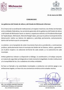De acuerdo con el documento, firmado por el secretario general de Gobierno de Jalisco, Salvador Zamora Zamora, y el secretario de Gobierno de Michoacán, Raúl Zepeda Villaseñor, el exhorto tiene como objetivo evitar incursiones fuera de los límites territoriales y posibles controversias jurídicas entre municipios de ambas entidades.