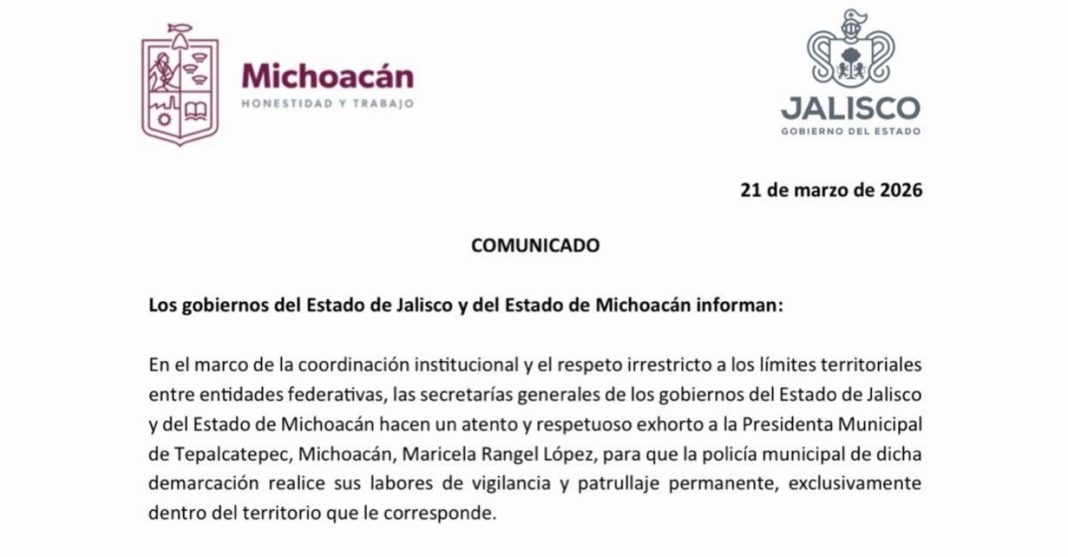 En un comunicado conjunto, los gobiernos de Michoacán y Jalisco hicieron un llamado respetuoso a la presidenta municipal de Tepalcatepec, Maricela Rangel López, para que la policía municipal actúe con estricto apego a las disposiciones legales y limite sus labores de vigilancia únicamente al territorio que corresponde a su jurisdicción.