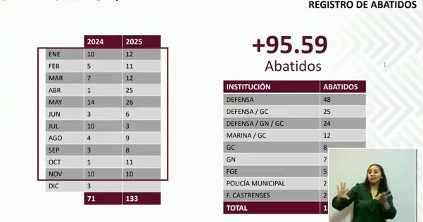 Añadió que personal de la Secretaría de la Defensa Nacional fue la instancia que más abatimientos realizó con 48 casos, mientras que en coordinación Defensa con Guardia Civil fueron 25 casos y la coordinación de Defensa, Guardia Nacional y Guardia Civil con 24 casos, así como la coordinación de Marina con Guardia Civil con 12 casos, entre otras instancias que se incluye la Fiscalía General de Justicia del Estado, Policías Municipales y Castrenses.