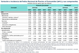 En octubre de 2025, el INPC presentó un nivel de 141.708: aumentó 0.36 % respecto al mes anterior. Con este resultado, la inflación general anual se ubicó en 3.57 por ciento. En el mismo mes de 2024, la inflación mensual fue de 0.55 % y la anual, de 4.76 %.