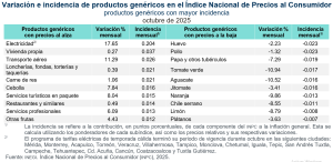 En octubre de 2025, los productos genéricos cuyas variaciones de precios, al alza y a la baja, destacaron por su incidencia sobre la inflación general fueron los siguientes: electricidad, vivienda propia, así como transporte aéreo, con incrementos en sus precios. En contraste, el huevo, el pollo, la papa y otros tubérculos, así como el tomate verde, disminuyeron sus precios.