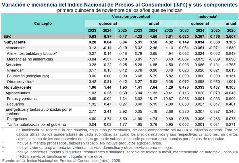 En la primera quincena de noviembre de 2025, la variación quincenal de los índices subyacente y no subyacente fue de 0.04 y 1.93 %, en ese orden. En la misma quincena de 2024, fue de 0.04 y 1.44 %.