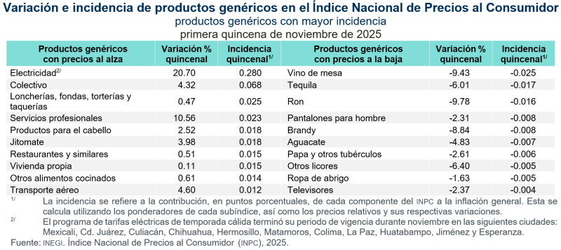 En la primera quincena de noviembre de este año, los productos genéricos cuyas variaciones de precios, al alza y a la baja, destacaron por su incidencia sobre la inflación general fueron los siguientes: electricidad; colectivo; loncherías, fondas, torterías y taquerías; así como servicios profesionales, con incrementos en sus precios. En contraste, el vino de mesa, el tequila y el ron disminuyeron sus precios.