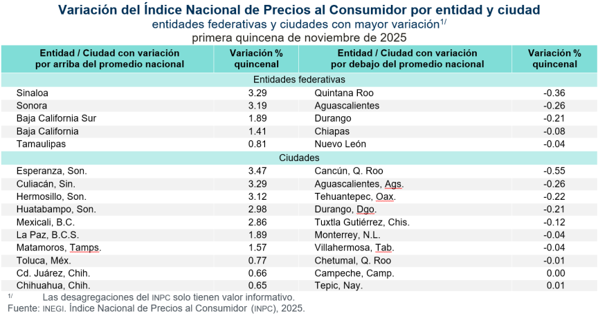 En la primera quincena de noviembre de 2025, el INPC registró un nivel de 142.470: aumentó 0.47 % respecto a la quincena anterior. Con este resultado, la inflación general anual se ubicó en 3.61 por ciento. En el mismo periodo de 2024, la inflación quincenal fue de 0.37 % y la anual, de 4.56 %.
