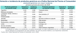 En la primera quincena de enero de este año, los productos genéricos cuyas variaciones de precios, al alza y a la baja, destacaron por su incidencia sobre la inflación general fueron los siguientes: cigarrillos; refrescos envasados; así como loncherías, fondas, torterías y taquerías con incrementos en sus precios. En contraste, el transporte aéreo, el huevo y el gas doméstico LP disminuyeron sus precios.