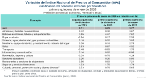 En la primera quincena de enero de 2026, el INPC registró un nivel de 143.466: aumentó 0.31 % respecto a la quincena anterior. Con este resultado, la inflación general anual se ubicó en 3.77 por ciento. En el mismo periodo de 2025, la inflación quincenal fue de 0.20 % y la anual, de 3.69 %.