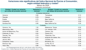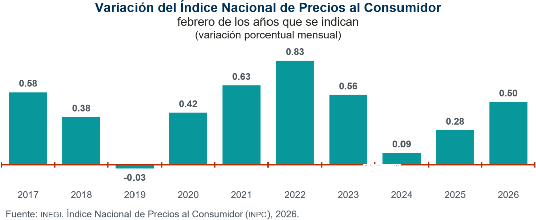 En febrero de 2026, el INPC presentó un nivel de 144.307: aumentó 0.50 % respecto al mes anterior. Con este resultado, la inflación general anual se ubicó en 4.02 por ciento. En el mismo mes de 2025, la inflación mensual fue de 0.28 % y la anual, de 3.77 %.