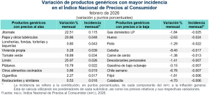 En febrero de 2026, los productos genéricos cuyas variaciones de precios, al alza y a la baja, destacaron por su incidencia sobre la inflación general fueron los siguientes: jitomate, papa y otros tubérculos, así como loncherías, fondas, torterías y taquerías, con incrementos en sus precios. En contraste, el gas doméstico LP, el huevo y el pollo disminuyeron sus precios.