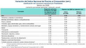 En la primera y segunda quincena de febrero de 2026, el INPC registró niveles de 144.064 y 144.551, respectivamente. Esto implicó un aumento quincenal de 0.34 por ciento.