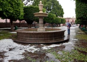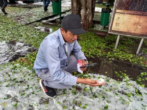 Alrededor de las 13 horas se registró una fuerte lluvia acompañada de granizo, principalmente en el primer cuadro, lo que generó sorpresa entre quienes estaban laborando o paseando por el primer cuadro.