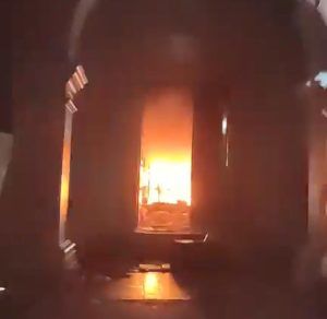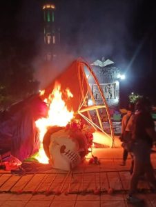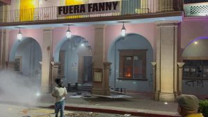 Acto seguido por la fuerza varios encapuchados ingresaron a las instalaciones municipales a destrozar mobiliario y prendieron fuego en algunas áreas al interior, subieron al segundo piso donde continuaron los destrozos y colocaron una manta en el barandal con la leyenda “Fuera Fanny”. El palacio municipal fue destrozado.